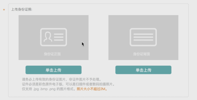 身份证照片请务必上传有效的身份证图片,非证件图片不予处理。身份证必须是彩色原件电子版,也可以数码拍摄照片。仅支持 .jpg .bmp .png 的图片格式。照片大小不超过2M。
