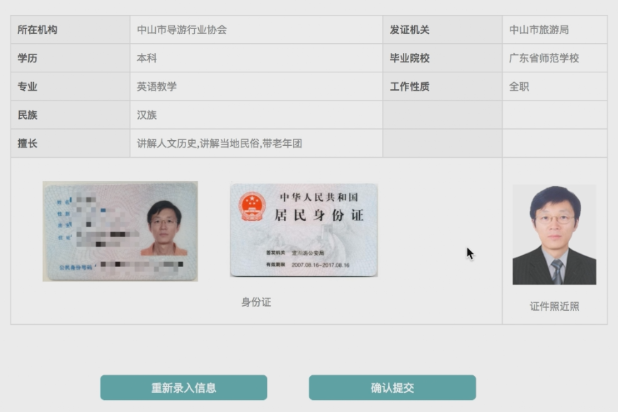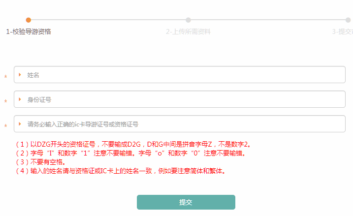 校验导游资格:请填写姓名、身份证号、导游资格证号并提交。