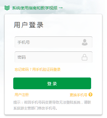 点击用户注册(注意:需要使用执业过程中的手机号进行注册,便于后续登陆接收信息和执业过程中查看带团信息等使用,手机号码和密码一定要记好,后续登录账号就是手机号,并且是唯一的)