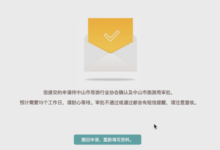 递交申请后,导游要做的申请工作已经完成,申请进度都会通过您的注册手机号进行短信通知。